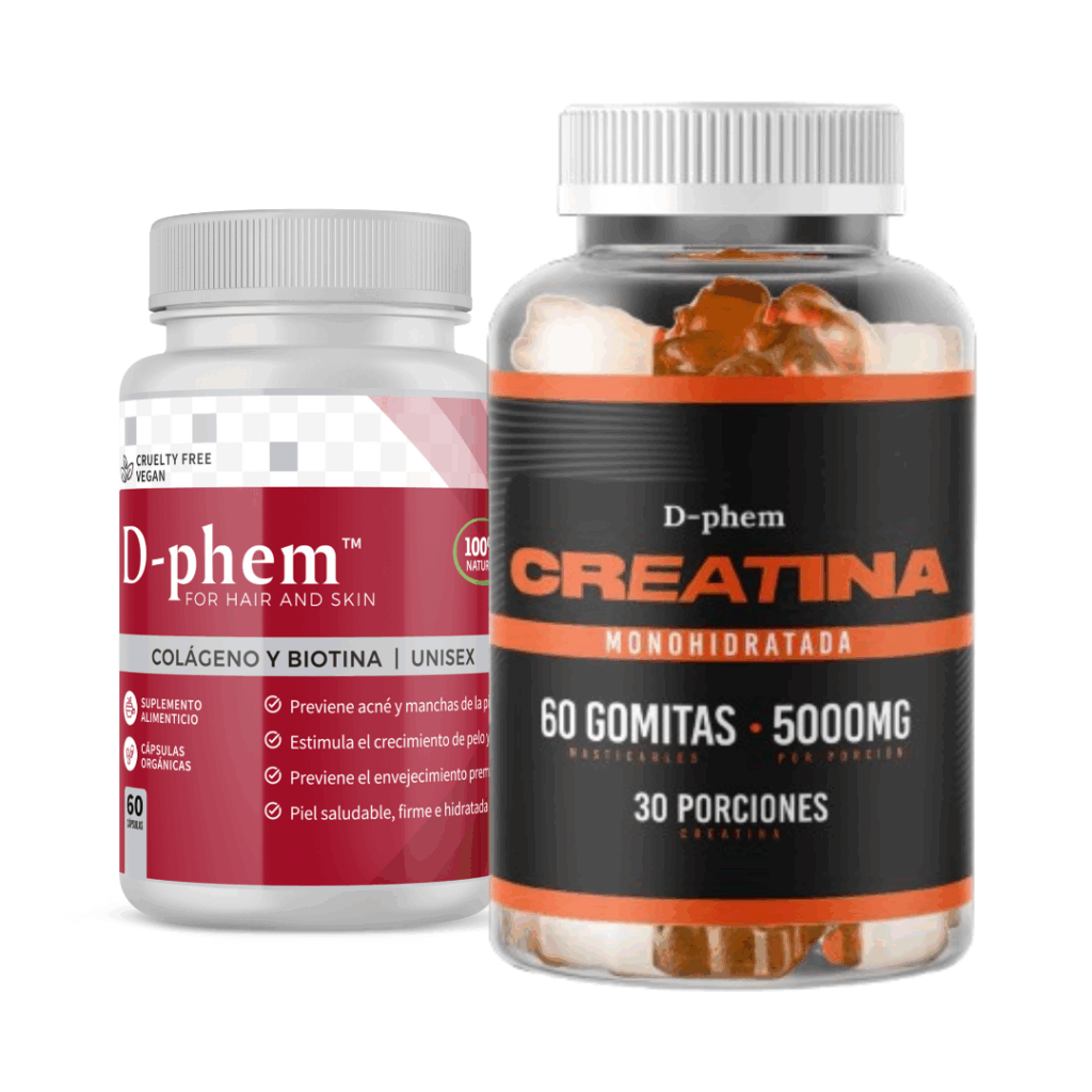 Este pack se compone por 2 suplementos naturales que aportan calidad de vida y salud. Creatina en gomitas y Colágeno & Biotina D-phem. No más, caídas de pelo, piel seca y dañada, pérdida muscular y energía mental.