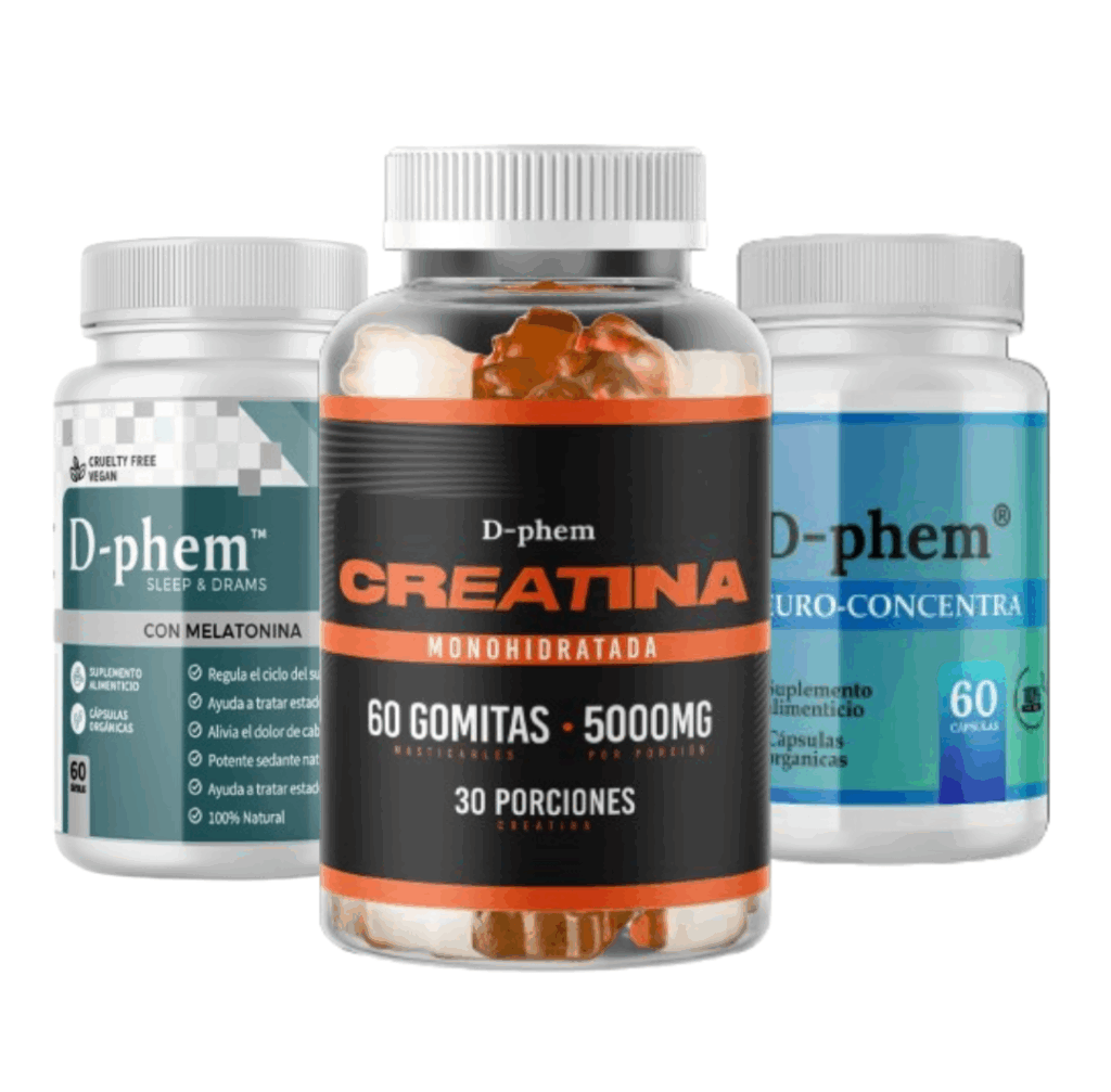 D-phem "Sleep & Dream" ( con Melatonina )Cruelty free and Vegan. PRODUCTO CERTIFICADO RESOLUCIÓN SEREMI ANÁLISIS DE LABORATORIO 100% Natural Apto para celíacos, no contiene gluten.Porque estamos preocupados por el buen dormir, uno de los principales problemas de nuestra sociedad moderna, es que hemos creado una fórmula diseñada por nuestros especialistas, en la constante búsqueda del bienestar de nuestros clientes. Esta fórmula ayuda a regular el ciclo del sueño, a tratar estados depresivos, alivia el dolor de cabeza y jaquecas, es un potente sedante natural y ayuda a tratar estados nerviosos.Composición : Melatonina, Melissa, Pasiflora, Valeriana, Cedrón, Salvia, Naranjo y Avena.Modo de uso: Tomar una cápsula, 15 minutos antes de acostarse, con poca agua.*El color y forma del envase pueden variar según disponibilidad*Cada frasco contiene 60 cápsulas, para 2 meses de uso. NEURO-CONCENTRAProducto Vegano, certificado, Resolución SEREMI, Análisis de laboratorio, 100% natural, Sin gluten.Es el aliado perfecto para quienes desean mejorar su enfoque, claridad mental y resistencia al estrés. Su fórmula innovadora combina ingredientes de origen natural que trabajan en sinergia para fortalecer el cerebro y mantenerlo saludable:Ashwagandha: Adaptógeno estrella que disminuye el estrés, regula las hormonas y potencia la energía mental.Hierbas clave: Ginkgo Biloba, Bacopa Monnieri y Rhodiola Rosea mejoran la circulación cerebral, potencian la memoria y aumentan la resistencia física y cognitiva.Energía equilibrada: Con Acetil-L-Carnitina, L-teanina energizantes para un impulso sin nerviosismo ni desgaste.Mejora neuronal: Fosfatidilserina, esencial para la comunicación entre neuronas, agudiza la mente y mejora la memoria.Vitaminas esenciales: B6, B9, B12 y Magnesio optimizan el funcionamiento cerebral, reducen la fatiga y promueven la relajación.Omega-3: DHA y EPA, ácidos grasos que protegen las células cerebrales y aseguran un rendimiento cognitivo sostenido.Perfecto para estudiantes, profesionales o cualquier persona que desee mantener el equilibrio mental, maximizar su capacidad intelectual y disfrutar de un cerebro sano a largo plazo. ¡Con NEURO-CONCENTRA, nada te detendrá!Modo de uso: 2 cápsulas diarias con agua, mañana y tarde.Presentación: 60 cápsulas (1 mes).Nota: Color y forma del envase y cápsulas, pueden variar según disponibilidad