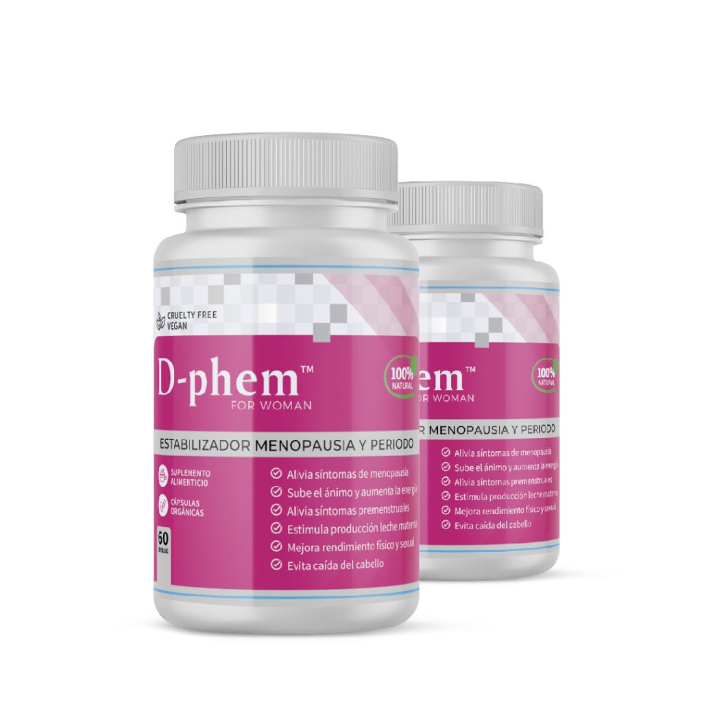 D-phem “Estabilizador Menopausia y periodo”Cruelty free and VeganPRODUCTO CERTIFICADORESOLUCIÓN SEREMIANÁLISIS LABORATORIO Producto vegano, 100% natural, apto para celíacos, no contiene gluten.Apto para mujeres de diferentes edades, y hombres dependiendo de las necesidades. ESTABILIZADOR MENOPAUSIA Y PERIODO, es una fórmula creada por nuestros especialistas con el fin de ayudar de forma efectiva y natural, a los molestos y a veces invalidantes síntomas de la menopausia, como los bochornos, los cambios bruscos de ánimo, la resequedad de todos los fluidos del cuerpo, la caída del cabello y falta de rendimiento general. Alivia los síntomas de la menopausia.Estabiliza el ánimo.Alivia los síntomas premenstruales.Estimula la producción de leche materna.Mejora el rendimiento físico y sexual.Aumenta la energía.Evita la caída del cabello. Componentes:Fenogreco, Creatina, Maca, Hinojo, Vitamina D, Vitamina E, Aguaje, Cafeína El fenogreco es una hierba medicinal que cada vez cobra más popularidad, especialmente para la pérdida de peso y el control de diversas condiciones hormonales en la mujer. Esta planta, proveniente del sur de Europa y de Asia, tiene múltiples propiedades estimulantes, laxantes y antiinflamatorias. El fenogreco es una planta cuyos beneficios generales favorecen tanto a las mujeres como a los hombres, sin embargo, cuenta con ventajas particulares que pueden ser adecuadamente aprovechadas por el sexo femenino.Entre los beneficios del fenogreco para las mujeres destaca su contenido de estrógenos vegetales, los que ayudan a aumentar el aporte de esta hormona consiguiendo:Combatir el dolor menstrual al aumentar la cantidad de estrógenos en el cuerpo, lo que ayudaría a reducir las molestias ocasionadas por el síndrome premenstrual y también durante los primeros días de la menstruación.Mejorar los síntomas de la menopausia, ayudando a sustituir de forma natural la disminución de los estrógenos propia de esta etapa. Debido a su contenido de diosgenina se consigue una compensación hormonal que puede disminuir notablemente los síntomas propios de la menopausia.Si estás amamantando a tu bebé el fenogreco es un excelente aliado pues estimula la producción de leche materna debido a su contenido de diosgenina, que ayuda a aumentar el volumen y cantidad de leche.Otra de las propiedades que ha ayudado a popularizar esta hierba medicinal es su capacidad de disminuir el tejido adiposo de nuestro cuerpo, facilitando la eliminación de grasa y favoreciendo la reducción del colesterol LDL o malo, lo que no solo contribuye a nuestra salud general, sino que además estimula la pérdida de peso.Reduce los niveles de azúcar en la sangre, favoreciendo a los pacientes con resistencia a la insulina y diabetes. Debido a su contenido de aminoácidos estimula también la producción de insulina, que puede ser útil en este tipo de patologías.Debido a su contenido de antioxidantes esta hierba medicinal ayuda a prevenir la proliferación de radicales libres, responsables del envejecimiento prematuro y de condiciones como el cáncer. Al mismo tiempo este aporte contribuye a la disminución de la mucosidad por lo que se trata de una planta ideal para el tratamiento natural de la congestión nasal, la sinusitis o la tos con flema. Modo de Uso: Ingerir 2 cápsulas al día, con abundante agua, mañana y tarde. No exceder un máximo de 3 al día. *El color y forma del envase pueden variar según disponibilidad* CONTRAINDICACIONESMujeres embarazadas. Mujeres que ingieren anticonceptivos, pues puede intervenir en su eficacia. Quienes ingieren anticoagulantes o aspirina.Cada frasco contiene 60 capsulas, aproximadamente, para un mes de tratamiento.