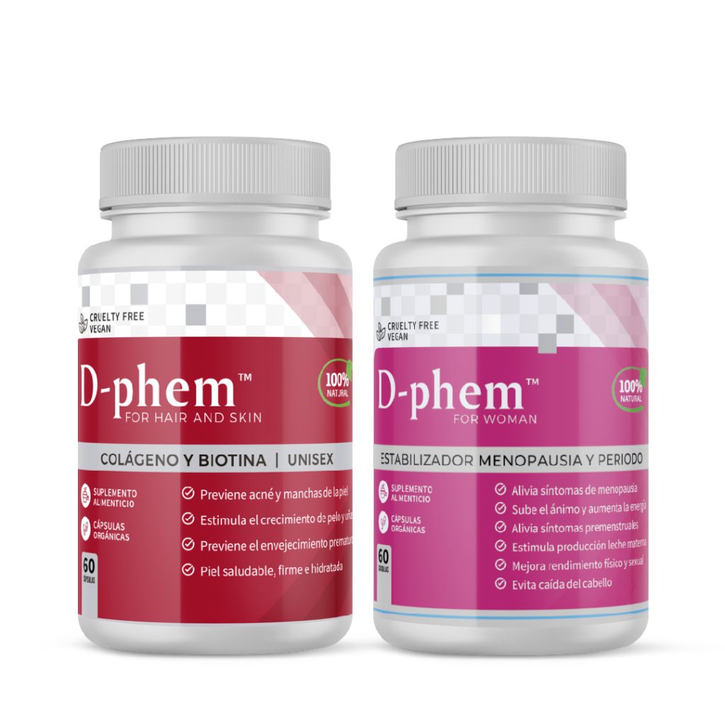 D-phem "Colágeno y Biotina" (Hair and Skin)Fórmula con micronutrientes, vitaminas, minerales y aminoácidos para aliviar dolores articulares, fortalecer piel, uñas, huesos, ligamentos, tendones y cartílagos. Hidrata, nutre y repara el cabello, frena su caída, aumenta grosor, firmeza y volumen. Purifica y disminuye inflamaciones en el cuero cabelludo. Mejora textura y firmeza de la piel, controla presión arterial, mantiene humectación de tejidos y favorece producción de ácidos grasos para piel saludable.Componentes: Ácido fólico, Biotina, Calcio, Cisteína, Colágeno, Leucina, Lisina, Metionina, Selenio, Vitamina A, Vitamina C, Complejo B.Sus resultados son paulatinos D-phem "Estabilizador Menopausia y periodo.Alivia síntomas de menopausia y periodo menstrual. Regula sistema hormonal, haciendo producir Estrógenos naturalmente.Reduce bochornos y sequedad vaginal, estabiliza el ánimo, mejora rendimiento físico y sexual, aumenta energía, evita caída del cabello. Reduce tejido adiposo, colesterol LDL y niveles de azúcar, protege el estómago, tiene propiedades estimulantes, laxantes, antiinflamatorias y antioxidantes.Componentes: Fenogreco, Creatina, Maca, Hinojo, Vitamina D, Vitamina E, Aguaje, Cafeína.Se ven resultados a los pocos días